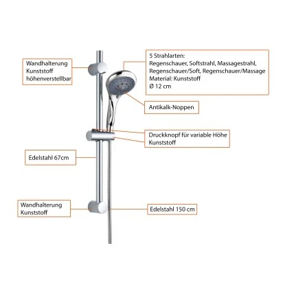 Die Antikalk-Noppen sorgen für die einfache Entfernung von Kalkrückständen. Zum Lieferumfang gehört doppelt gewickelter Edelstahl-Brauseschlauch mit 1/2 Zoll Standard-Anschluss. Variable Wandhalterung ermöglicht die Nutzung vorhandener Bohrlöcher.