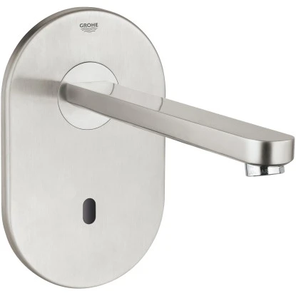 Die Grohe Infrarot-Elektronik für Ihren Waschtisch-Wandarmatur Eurosmart CE besitzt einen Infrarot-Sensor für bidirektionale Kommunikation für kaltes oder vorgemischtes Wasser. Sie besitzt einen Trafo 100-230 V AC, 50-60 Hz, 6 V DC. Die Armatur wird umrandet von einer Edelstahl-Rosette. Der hochwertige Edelstahl-Auslauf misst eine Ausladung von 23,2 cm.