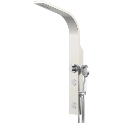 Das hochwertige Schütte Duschpaneel Sansibar aus Edelstahl ist in jedem Bad ein Hingucker und kann nebenbei auch mit tollen Funktionen überzeugen. Mit einer Kopf- und einer Handbrause sowie mit 2 Massagedüsen sorgt das Paneel für ein unvergessliches Duscherlebnis zum Entspannen und Wohlfühlen. Die Handbrause verfügt über 3 Strahlvarianten, wählen Sie je nach Wunsch zwischen dem Massagestrahl, dem Regenschauer und dem Kombistrahl. Mit Hilfe des integrierten Umstellers können sie ganz einfach zwischen den 3 Funktionen wechseln. Für eine schnelle und leichte Reinigung sind sowohl die Hand- als auch die Kopfbrause mit Antikalknoppen ausgestattet. Kalkrückstände haben hier keine Chance und können einfach mit dem Finger entfernt werden. Der Brauseschlauch sowie der Anschlussschlauch aus Edelstahl sind doppelt gewickelt und verfügen über einen Standard G 1/2 Anschluss. Dank strenger Qualitätskontrollen und hochwertigen Materialien wird eine hohe Sicherheit und beste Wasserqualität garantiert.