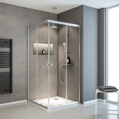 Der Schulte Eckeinsteig Sunny ist eine moderne Eckdusche mit Schiebetüren. Mit großen Elementen aus Einscheibensicherheitsglas und silberfarbenen Aluminiumprofilen gestalten Sie Ihr Bad modern und zeitgemäß. Dank der Schiebetüren öffnen Sie die Duschkabine besonders platzsparend.