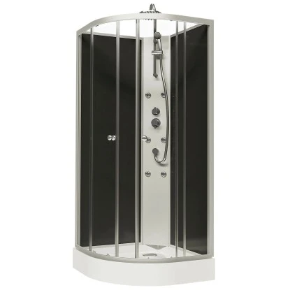 Die Kabine setzt sich aus insgesamt sechs Echtglaselementen zusammen. Zwei Schiebetüren, welche an zwei feststehenden Elementen montiert sind, sowie zwei Rückwände in elegantem Grau. All diese Elemente bestehen aus 4 mm starkem, nach DIN Norm EN 12150 gefertigtem, Einscheibensicherheitsglas. Dieses spezielle Echtglas zeichnet sich insbesondere durch seine hohe Widerstandskraft gegenüber äußeren Einwirkungen aus.