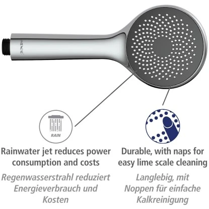 Das innovative Duschkopf-Sortiment von Wenko überzeugt durch Funktionalität, Design und Qualität und verwandelt Ihr Badezimmer in eine Wellness-Oase. Mit der Watersaving Universal-Handbrause sind Sie bestens ausgestattet. Neben der Regenstrahl-Funktion, die Sie wie ein sanfter, angenehmer Tropenschauer entspannt, verfügt dieser Duschkopf über weitere, clevere Funktionen. Auch bei Duschköpfen setzt Wenko auf Nachhaltigkeit! Mit den Watersaving Duschköpfen sparen Sie Wasser, Energie und Geld. Alle Modelle mit dem nachhaltigen Watersaving System sind so konzipiert, dass mit Hilfe eines Wasserspareinsatzes weniger als 8 Liter Wasser pro Minute verbraucht werden (bei 3 Bar Wasserdruck) ohne, dass es bewusst wahrgenommen wird. So werden 40% Wasser gespart bei vollem Komfort – denn ein konstanter Durchfluss mit sattem Wasserstrahl ist nach wie vor gewährleistet. Der Brausekopf ist aus stabilem, dunkelgrauem ABS gefertigt und mit glänzendem Chrom ummantelt. Ausgestattet mit praktischen Noppen, die für eine einfache Kalkreinigung sorgen, erhält die Handbrause eine langlebige Nutzungsdauer. Eventuelle Kalkablagerungen an den Düsen können einfach mit den Fingern abgerieben werden. Die komfortable Duschbrause verfügt über einen Universalanschluss mit 1/2 Zoll und ist natürlich auch für Durchlauferhitzer geeignet. Den passenden Duschschlauch in verschiedenen Ausführungen hat Wenko auch im Sortiment. Überzeugend: Die unabhängige Fachjury des Magazins „Baumarkt Manager“, die bei der Bewertung unter anderem den Nachhaltigkeitsaspekt in den Fokus stellte, hat die Watersaving Duschköpfe von Wenko in der Kategorie „Wohnen“ zum Produkt des Jahres 2020/2021 gewählt.